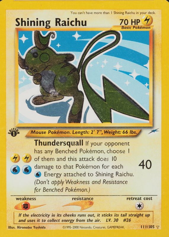 Shining Raichu's Pokemon cards are available in at least 1 sets. Shining Raichu's biggest 7-day price movers are 2002 Neo Destiny #111/105 1st Edition Holo, and 2002 Neo Destiny #111/105 Holo.