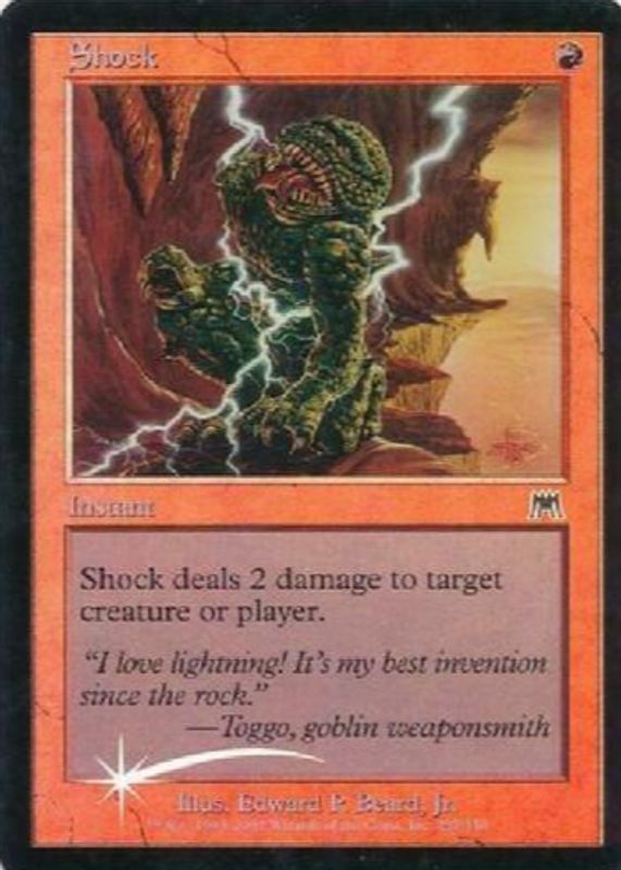 Shock's Magic: The Gathering cards are available in at least 3 sets. Shock's biggest 7-day price movers are 2002 Onslaught #227 Foil, 1999 Sixth Edition #206 Base, and 1998 Stronghold Base.