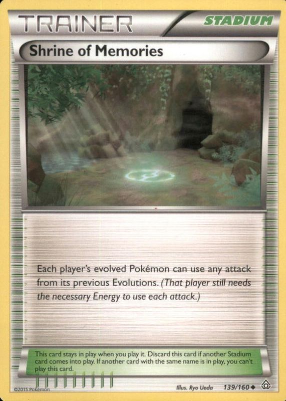 Shrine of Memories' Pokemon cards are available in at least 2 sets. Shrine of Memories' biggest 7-day price movers are 2015 XY: Primal Clash #139/160 Base, 2015 XY: Primal Clash #139/160 Reverse Holo, and 2014 Japanese XY: Gaia Volcano #068/070 1st Edition.