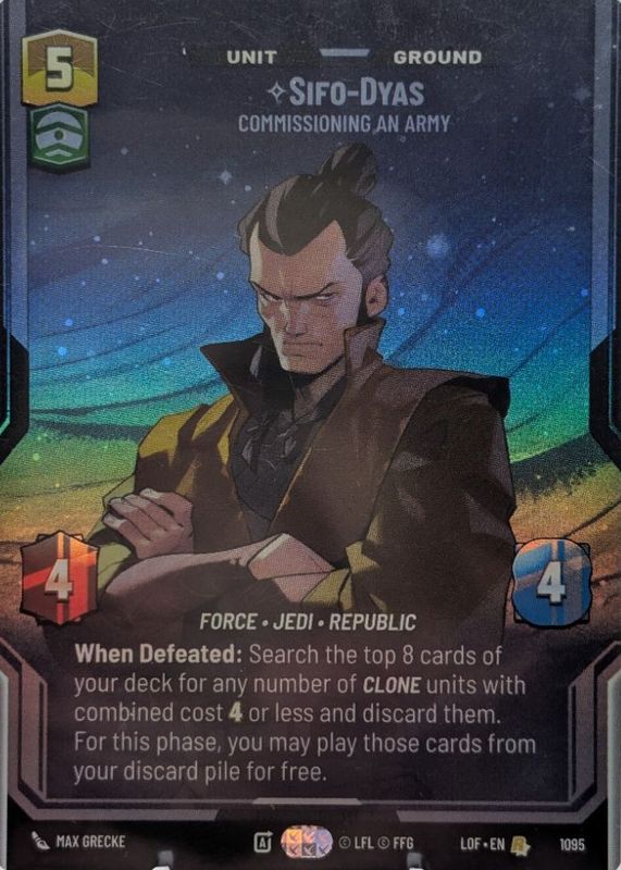 Sifo-Dyas - Commissioning An Army's Star Wars Unlimited cards are available in at least 1 sets. Sifo-Dyas - Commissioning An Army's biggest 7-day price movers are 2025 Legends of the Force #1095 Prestige Foil, 2025 Legends of the Force #1049 Prestige, and 2025 Legends of the Force #1141 Prestige Serialized /250.