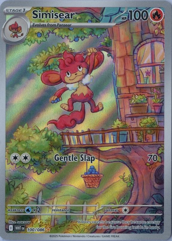 Simisear's Pokemon cards are available in at least 14 sets. Simisear's biggest 7-day price movers are 2025 Japanese Scarlet & Violet: White Flare #100/086 Art Rare, 2012 Japanese Black & White: Plasma Gale #014/070 1st Edition, and 2015 Japanese XY: Red Flash #012/059 1st Edition.