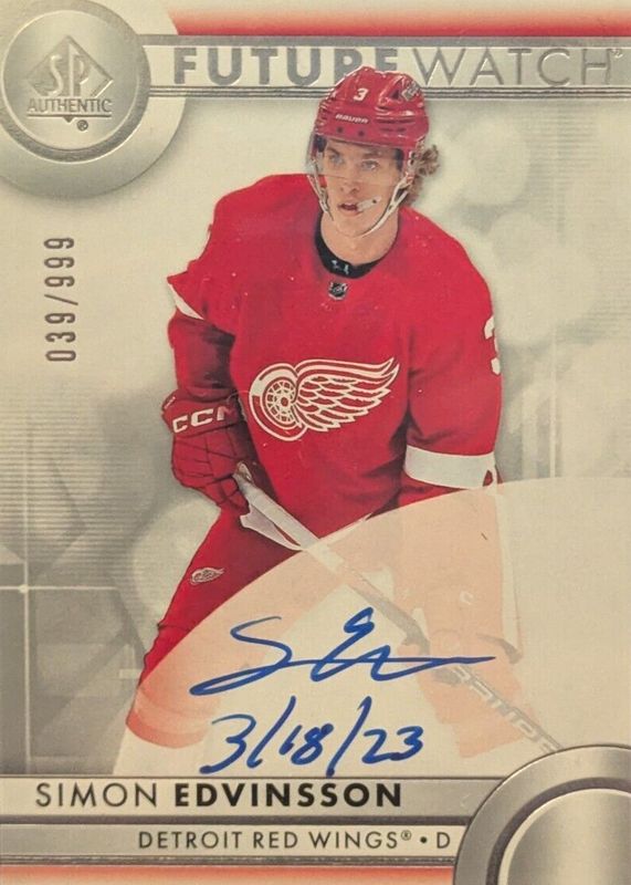 Simon Edvinsson's Hockey cards are available in at least 24 sets. Simon Edvinsson's biggest 7-day price movers are 2023 Upper Deck #228 Young Guns Base, 2023 Upper Deck #C113 Young Guns Canvas, and 2023 SP Authentic #151 Future Watch Auto - Inscriptions /50.