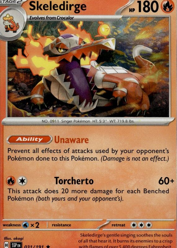 Skeledirge's Pokemon cards are available in at least 2 sets. Skeledirge's biggest 7-day price movers are 2024 Scarlet & Violet: Surging Sparks #031/191 Holo, 2024 Scarlet & Violet: Surging Sparks #031/191 Reverse Holo, and 2024 Japanese Scarlet & Violet: Super Electric Breaker #019/106 Holo.