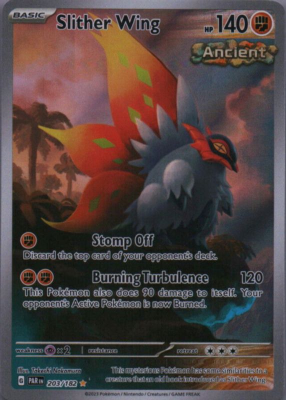 Slither Wing's Pokemon cards are available in at least 4 sets. Slither Wing's biggest 7-day price movers are 2023 Scarlet & Violet: Paradox Rift #203/182 Illustration Rare, 2024 Japanese Scarlet & Violet: Night Wanderer #026/064 Base, and 2024 Japanese Scarlet & Violet: Terastal Fest ex #087/187 Base.
