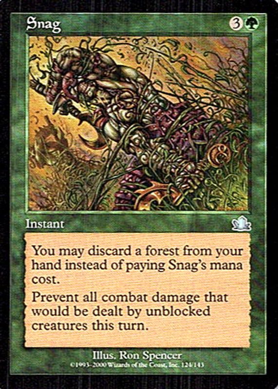 Snag's Magic: The Gathering cards are available in at least 1 sets. Snag's biggest 7-day price movers are 2000 Prophecy #124 Base.