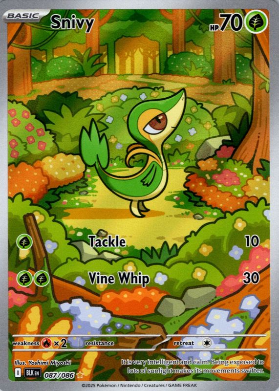 The biggest 30-day change Snivy cards are 2025 Scarlet & Violet: Black Bolt #001/086 Reverse Holo, 2025 Scarlet & Violet: Black Bolt #087/086 Illustration Rare, and 2016 Japanese XY: Awakening Psychic King #005/078 1st Edition.
