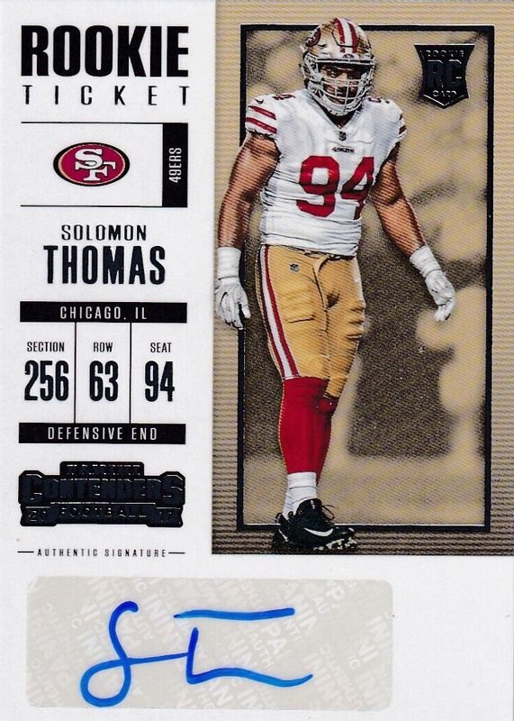 Solomon Thomas' Football cards are available in at least 2 sets. Solomon Thomas' biggest 7-day price movers are 2017 Contenders #116 Rookie Ticket Auto, 2017 Optic #116 Blue /149, and 2017 Optic #116 Black /25.