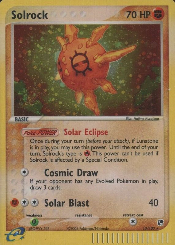 Solrock's Pokemon cards are available in at least 26 sets. Solrock's biggest 7-day price movers are 2025 Mega Evolution #075/132 Base, 2023 Sword & Shield: Crown Zenith #GG15/GG70 Galarian Gallery, and 2003 EX: Sandstorm #013/100 Holo.