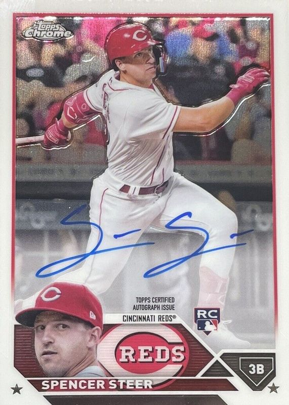 Spencer Steer's Baseball cards are available in at least 38 sets. Spencer Steer's biggest 7-day price movers are 2023 Topps Stadium Club #SCBA-SS Autographs, 2023 Topps Chrome Update Sapphire Edition #USA-SS Autographs /199, and 2024 Topps #485 Golden Mirror Image Variation /(SSP).