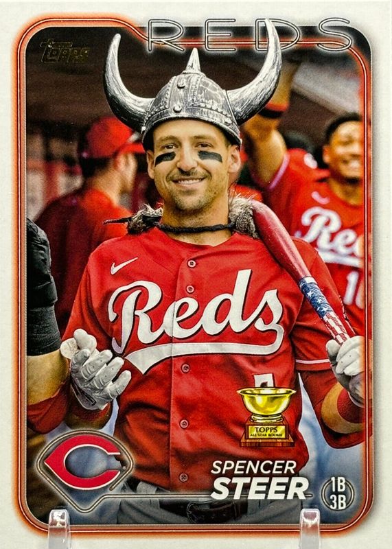 Spencer Steer's Baseball cards are available in at least 37 sets. Spencer Steer's biggest 7-day price movers are 2023 Topps Chrome #RA-SS Rookie Autographs, 2024 Topps #485 Golden Mirror Image Variation /(SSP), and 2025 Topps Museum Collection #MMI-SST Museum Memorabilia /1.