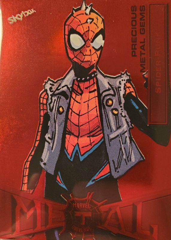 Spider-Punk's Marvel cards are available in at least 3 sets. Spider-Punk's biggest 7-day price movers are 2021 Skybox Marvel Metal Universe Spider-Man #86 Precious Metal Gems Red /90, 2021 Skybox Marvel Metal Universe Spider-Man #186 Light FX Turquoise (High Series) /50, and 2021 Skybox Marvel Metal Universe Spider-Man #86 Light FX Gold.