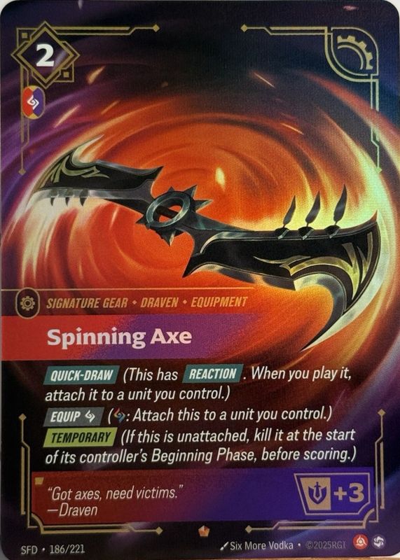 Spinning Axe's Riftbound cards are available in at least 1 sets. Spinning Axe's biggest 7-day price movers are 2026 Spiritforged #186/221 Epic.