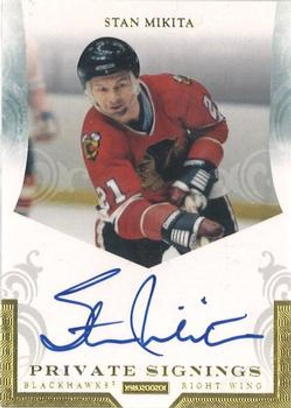 Stan Mikita's Hockey cards are available in at least 72 sets. Stan Mikita's biggest 7-day price movers are 2010 Panini Luxury Suite #MIK Private Signings, 2010 Panini Luxury Suite #MIK Private Signings Platinum /1, and 2012 Certified #I-4 Icons /250.