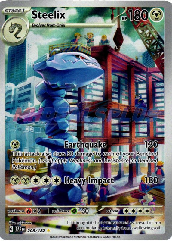 Steelix's Pokemon cards are available in at least 23 sets. Steelix's biggest 7-day price movers are 2000 Neo Genesis #15/111 1st Edition Holo, 2025 Japanese Mega Brave #73/63 Art Rare, and 2023 Scarlet & Violet: Paradox Rift #208/182 Illustration Rare.