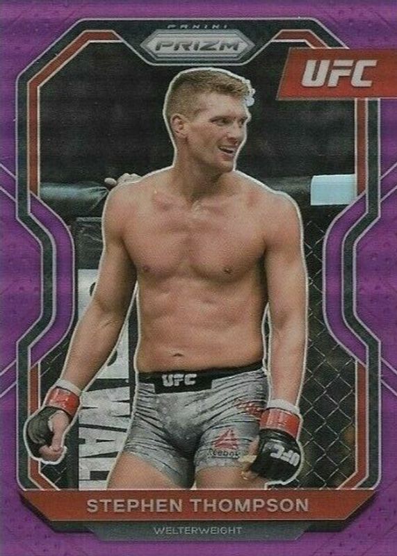 Stephen Thompson's MMA cards are available in at least 16 sets. Stephen Thompson's biggest 7-day price movers are 2021 Prizm UFC #81 Purple /149, 2021 Prizm UFC #81 Orange /99, and 2021 Prizm UFC #81 White Sparkle /(SSP).