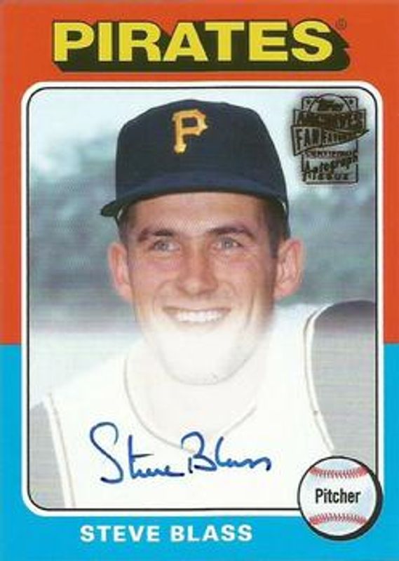 Steve Blass' Baseball cards are available in at least 21 sets. Steve Blass' biggest 7-day price movers are 2021 Topps Archives #FFA-SB Fan Favorites Autographs, 2021 Topps Archives #FFA-SB Fan Favorites Autographs - Blue /25, and 2021 Topps Archives #FFA-SB Fan Favorites Autographs - Purple /150.