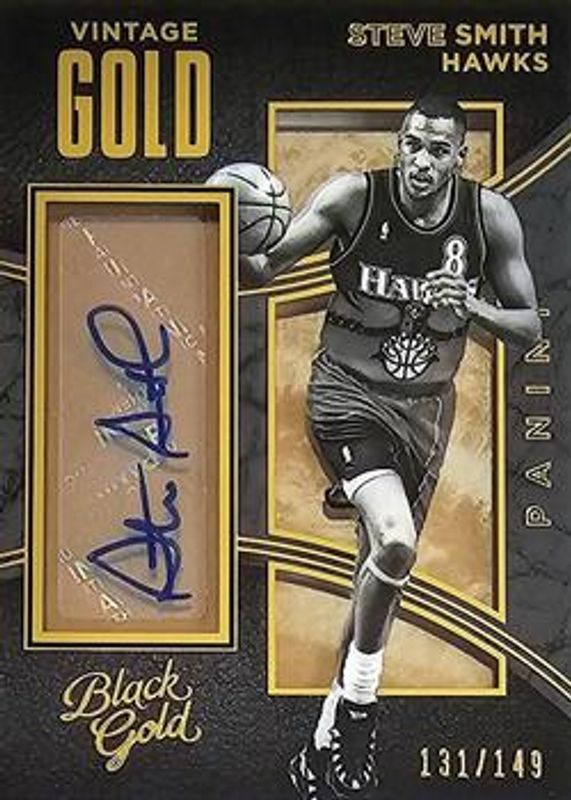 Steve Smith (NBA)'s Basketball cards are available in at least 132 sets. Steve Smith (NBA)'s biggest 7-day price movers are 2015 Black Gold #24 Vintage Gold Autographs /149, 2015 Black Gold #24 Vintage Gold Autographs - Holo /10, and 2015 Gold Standard #GG-SS Golden Graphs /35.