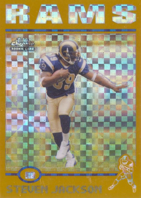 Steven Jackson's Football cards are available in at least 16 sets. Steven Jackson's biggest 7-day price movers are 2004 Topps Chrome #180 Gold X-Fractor /279, 2004 Topps Chrome #180 Black Refractor /100, and 2004 Bowman #260 1st Edition.