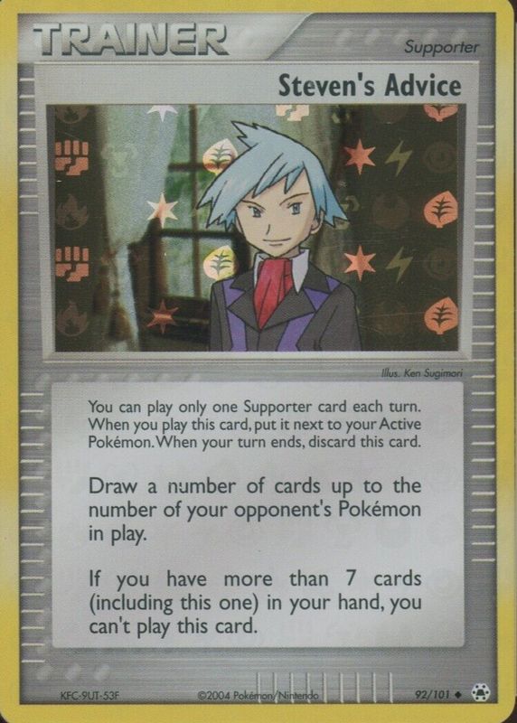 Steven's Advice's Pokemon cards are available in at least 2 sets. Steven's Advice's biggest 7-day price movers are 2004 EX: Hidden Legends #092/101 Reverse Holo, 2004 EX: Hidden Legends #092/101 Base, and 2007 EX: Power Keepers #083/108 Base.