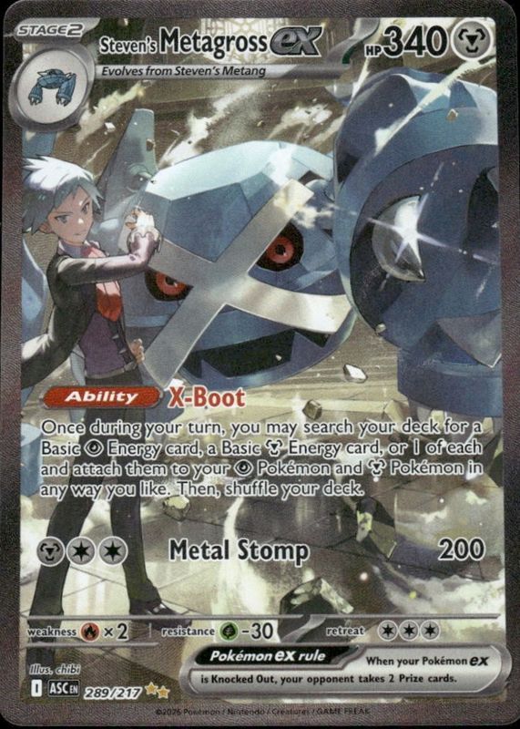Steven's Metagross ex's Pokemon cards are available in at least 3 sets. Steven's Metagross ex's biggest 7-day price movers are 2025 Scarlet & Violet: Destined Rivals #145/182 Double Rare, 2025 Japanese Mega: Mega Dream ex #245/193 Special Art Rare, and 2026 Mega Evolution: Ascended Heroes #289/217 Special Illustration Rare.