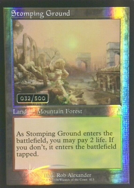 Stomping Ground's Magic: The Gathering cards are available in at least 3 sets. Stomping Ground's biggest 7-day price movers are 2013 Gatecrash #247 Base, 2024 Ravnica Remastered #413 Retro Frame /500, and 2013 Gatecrash #247 Foil.