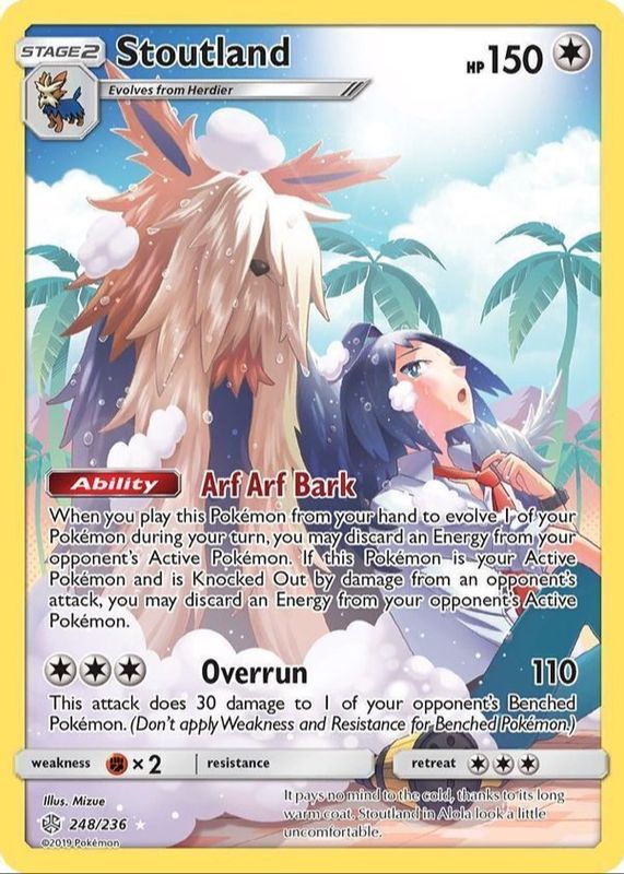Stoutland's Pokemon cards are available in at least 11 sets. Stoutland's biggest 7-day price movers are 2019 Sun & Moon: Cosmic Eclipse #248/236 Holo (Secret), 2025 Scarlet & Violet: White Flare #156/086 Illustration Rare, and 2025 Japanese Scarlet & Violet: White Flare #155/086 Art Rare.