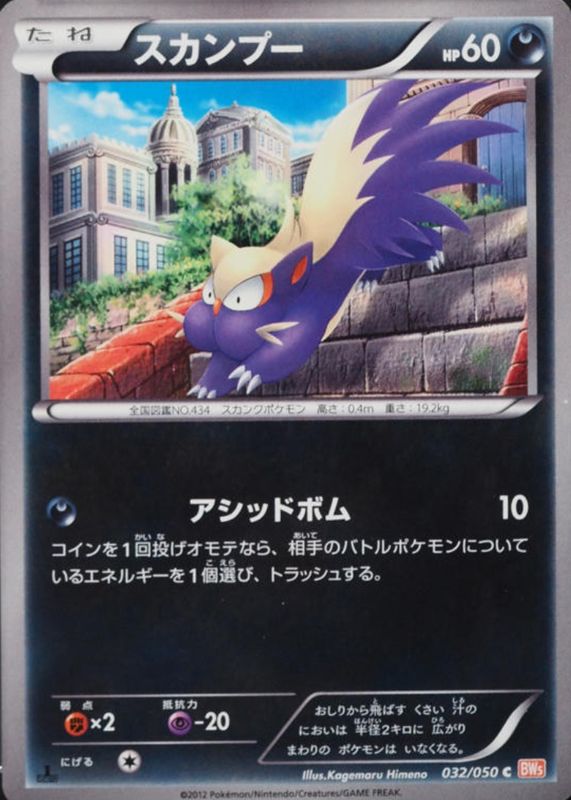 Stunky's Pokemon cards are available in at least 10 sets. Stunky's biggest 7-day price movers are 2008 Diamond & Pearl: Stormfront #076/100 Base, 2012 Japanese Black & White: Dragon Blade #032/050 1st Edition, and 2008 Japanese Diamond & Pearl: Intense Fight in the Destroyed Sky #063/092 Unlimited.