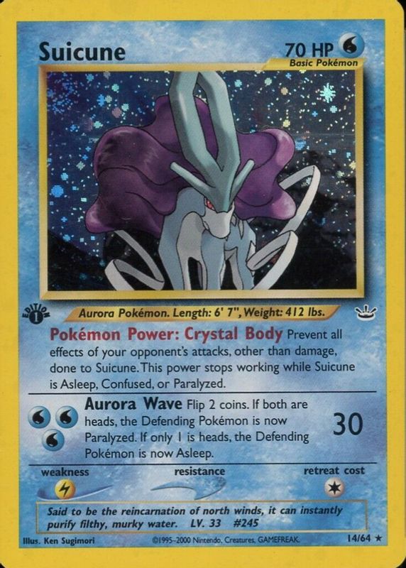 Suicune's Pokemon cards are available in at least 19 sets. Suicune's biggest 7-day price movers are 2025 Scarlet & Violet: Prismatic Evolutions #024/131 Poke Ball Reverse Holo, 2025 Mega Evolution: Phantasmal Flames #26/94 Holo, and 2001 Neo Revelation #14/64 1st Edition Holo.