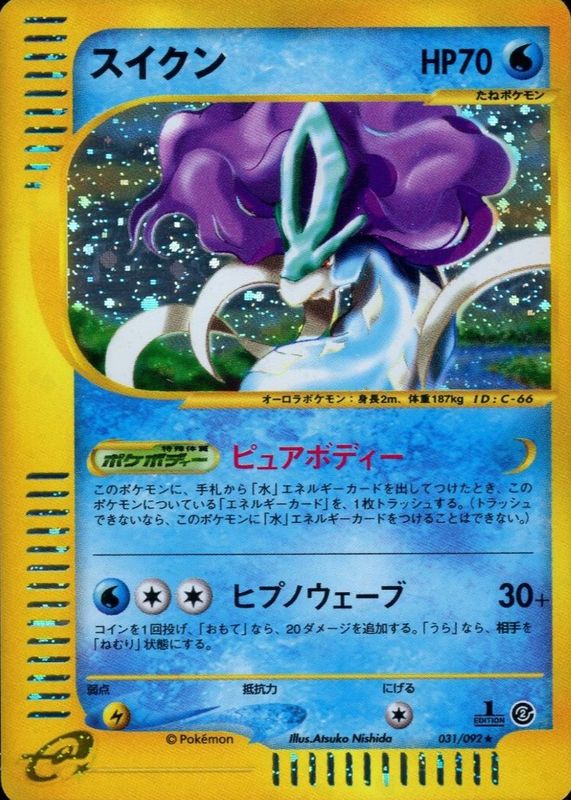 The biggest 30-day change Suicune cards are 2003 Aquapolis #037/147 Base, 2002 Japanese The Town on No Map #31/92 1st Edition Holo, and 2005 POP Series 2 #04/17 Holo.