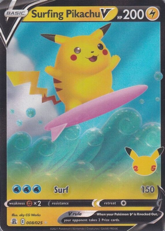 Surfing Pikachu V's Pokemon cards are available in at least 1 sets. Surfing Pikachu V's biggest 7-day price movers are 2021 Celebrations #008/025 Holo.