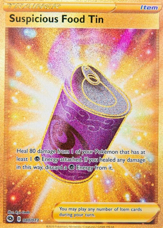 Suspicious Food Tin's Pokemon cards are available in at least 2 sets. Suspicious Food Tin's biggest 7-day price movers are 2020 Champion's Path #80/73 Holo (Secret), 2020 Japanese Sword & Shield: Explosive Walker #063/070 Base, and 2020 Japanese Sword & Shield: Explosive Walker #085/070 Ultra Rare (Secret).