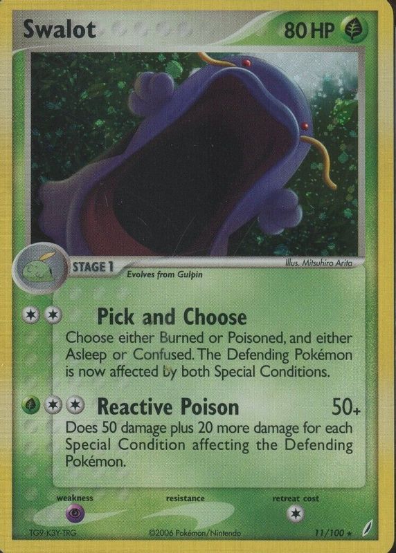 Swalot's Pokemon cards are available in at least 12 sets. Swalot's biggest 7-day price movers are 2006 EX: Crystal Guardians #011/100 Holo, 2004 EX: Hidden Legends #050/101 Reverse Holo, and 2009 Japanese Platinum: Advent of Arceus #045/090 Unlimited Holo.