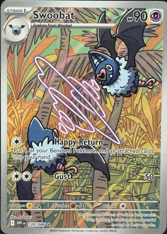 Swoobat's Pokemon cards are available in at least 13 sets. Swoobat's biggest 7-day price movers are 2024 Scarlet & Violet: Paldean Fates #033/091 Reverse Holo, 2025 Japanese Scarlet & Violet: White Flare #117/086 Art Rare, and 2025 Scarlet & Violet: White Flare #120/086 Illustration Rare.