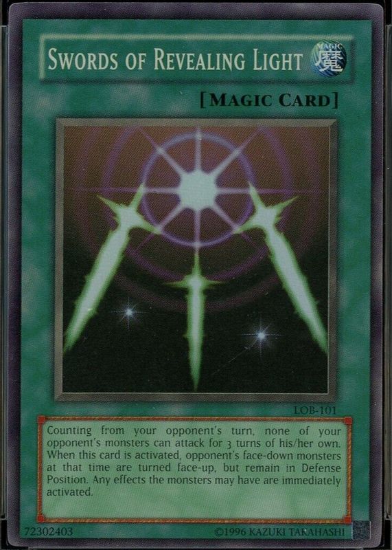 Swords of Revealing Light's Yu-Gi-Oh! cards are available in at least 1 sets. Swords of Revealing Light's biggest 7-day price movers are 2002 Legend of Blue Eyes White Dragon #LOB-101 Base (Super Rare), and 2002 Legend of Blue Eyes White Dragon #LOB-101 1st Edition (Super Rare).
