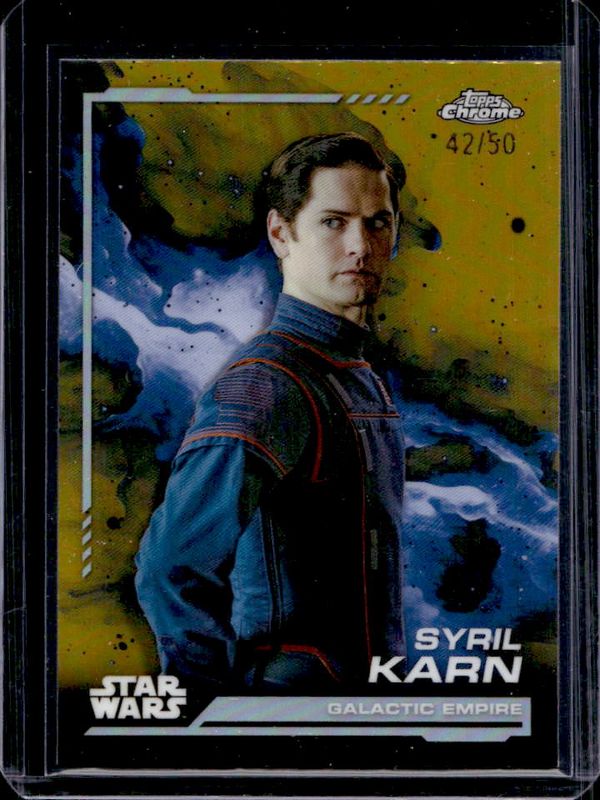 Syril Karn's Star Wars cards are available in at least 6 sets. Syril Karn's biggest 7-day price movers are 2024 Topps Chrome Star Wars #12 Gold Refractor /50, 2024 Topps Chrome Star Wars #12 Rainbow Refractor, and 2024 Topps Chrome Star Wars #12 Costco Super Box Red Blue /10.