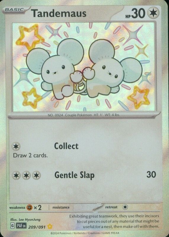 Tandemaus' Pokemon cards are available in at least 5 sets. Tandemaus' biggest 7-day price movers are 2024 Scarlet & Violet: Paldean Fates #209/091 Shiny Rare, 2023 Japanese Scarlet & Violet: Shiny Treasure ex #317/190 Shiny Rare, and 2024 Japanese Scarlet & Violet: Super Electric Breaker #091/106 Base.