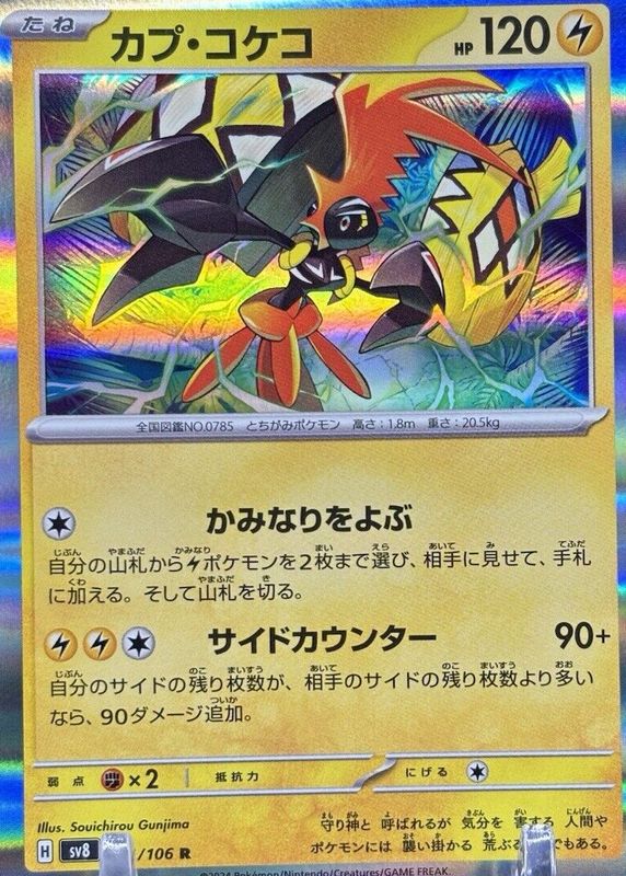 Tapu Koko's Pokemon cards are available in at least 6 sets. Tapu Koko's biggest 7-day price movers are 2024 Japanese Scarlet & Violet: Super Electric Breaker #041/106 Holo, 2019 Japanese Sun & Moon: Miracle Twin #028/094 Holo, and 2024 Scarlet & Violet: Surging Sparks #065/191 Holo.