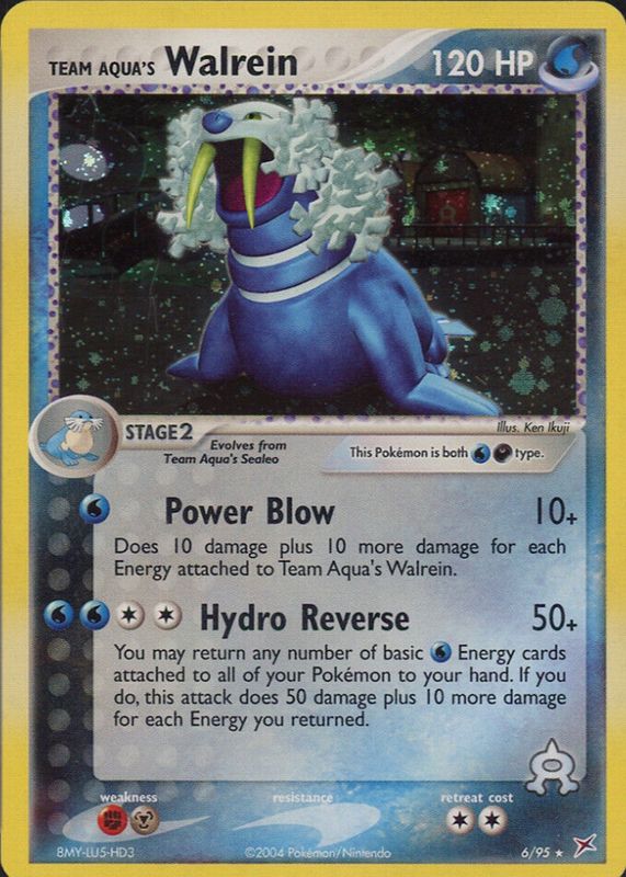Team Aqua's Walrein's Pokemon cards are available in at least 2 sets. Team Aqua's Walrein's biggest 7-day price movers are 2004 EX: Team Magma vs Team Aqua #06/95 Holo, 2004 EX: Team Magma vs Team Aqua #06/95 Reverse Holo, and 2015 XY: Double Crisis #05/34 Reverse Holo.