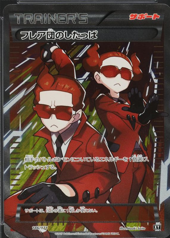 Team Flare Grunt's Pokemon cards are available in at least 2 sets. Team Flare Grunt's biggest 7-day price movers are 2017 Japanese XY: Best of XY #186/171 Holo (Full Art), 2017 Japanese XY: Best of XY #151/171 Base, and 2017 Japanese XY: Best of XY #151/171 Reverse Holo.