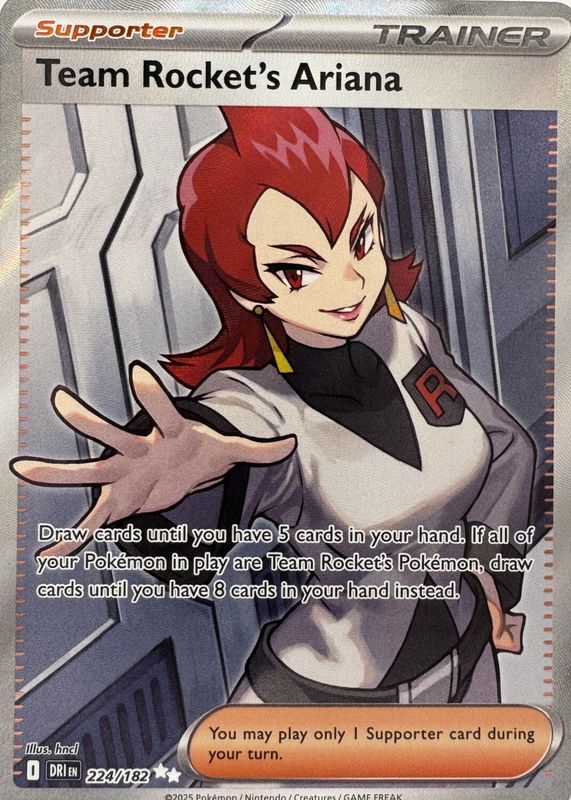 Team Rocket's Ariana's Pokemon cards are available in at least 4 sets. Team Rocket's Ariana's biggest 7-day price movers are 2026 Mega Evolution: Ascended Heroes #202/217 Reverse Holo, 2025 Scarlet & Violet: Destined Rivals #224/182 Ultra Rare (Full Art), and 2025 Japanese Scarlet & Violet: Glory of Team Rocket #119/098 Super Rare (Full Art).