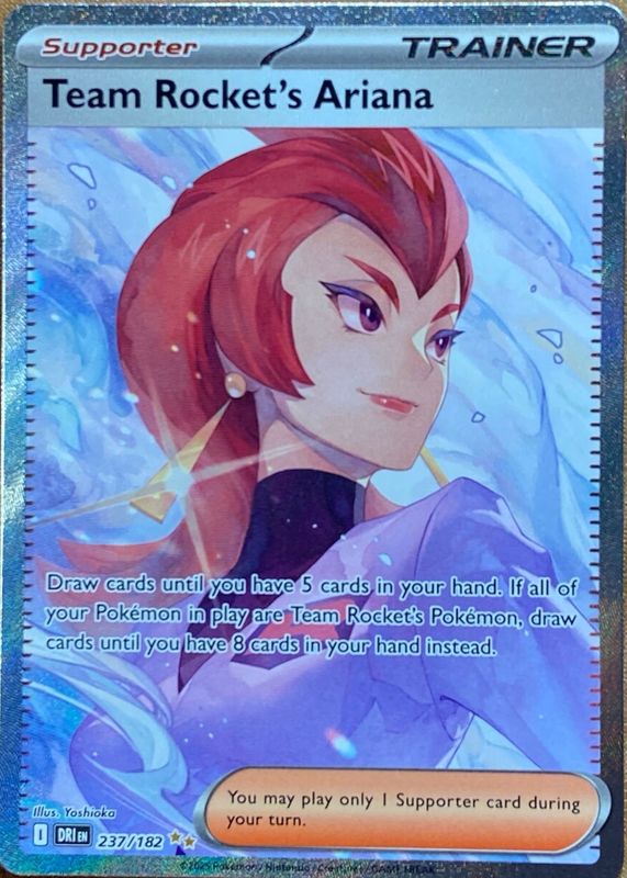 Team Rocket's Ariana's Pokemon cards are available in at least 3 sets. Team Rocket's Ariana's biggest 7-day price movers are 2025 Japanese Scarlet & Violet: Glory of Team Rocket #119/098 Super Rare (Full Art), 2025 Japanese Scarlet & Violet: Glory of Team Rocket #128/098 Special Art Rare, and 2025 Japanese Scarlet & Violet: Glory of Team Rocket #091/098 Base.