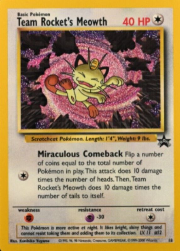 Team Rocket's Meowth's Pokemon cards are available in at least 3 sets. Team Rocket's Meowth's biggest 7-day price movers are 2000 Wizards Black Star Promo #18 Pokemon League, 2025 Japanese Scarlet & Violet: Glory of Team Rocket #078/098 Base, and 2025 Scarlet & Violet: Destined Rivals #149/182 Base.