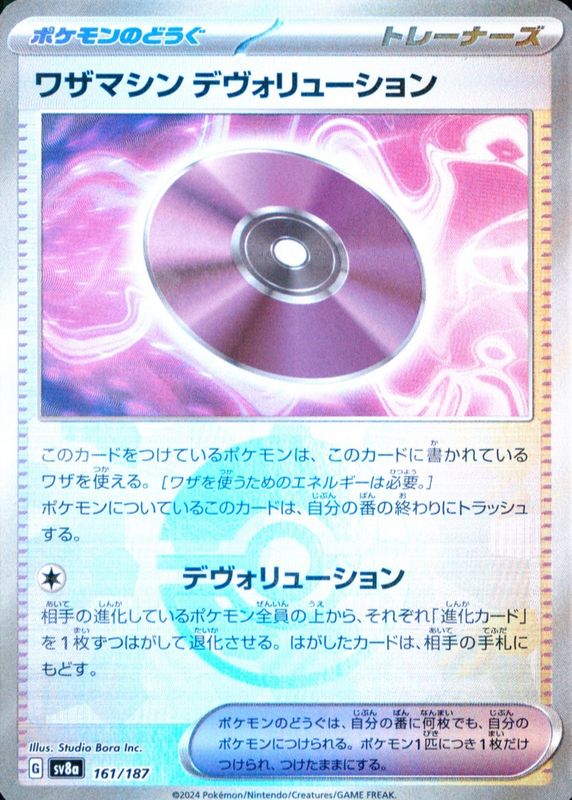 Technical Machine: Devolution's Pokemon cards are available in at least 1 sets. Technical Machine: Devolution's biggest 7-day price movers are 2024 Japanese Scarlet & Violet: Terastal Fest ex #161/187 Base, 2024 Japanese Scarlet & Violet: Terastal Fest ex #161/187 Reverse Holo, and 2024 Japanese Scarlet & Violet: Terastal Fest ex #161/187 Master Ball Reverse Holo.