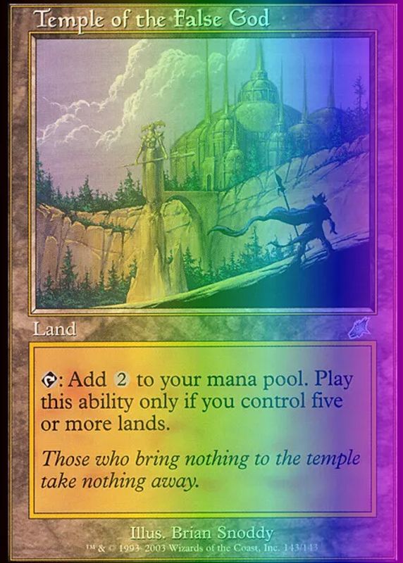 Temple of the False God's Magic: The Gathering cards are available in at least 1 sets. Temple of the False God's biggest 7-day price movers are 2003 Scourge #143 Foil, and 2003 Scourge #143 Base.