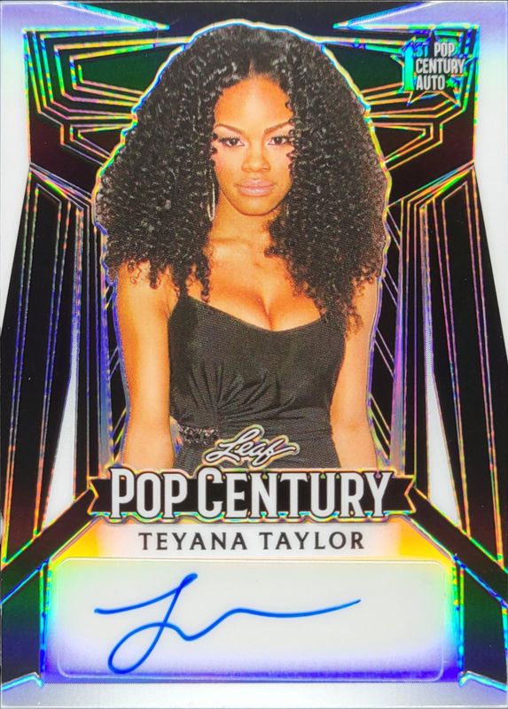 Teyana Taylor's Pop Culture cards are available in at least 1 sets. Teyana Taylor's biggest 7-day price movers are 2023 Leaf Metal Pop Century #BA-TT1 Autographs Crystal Pink /12, 2023 Leaf Metal Pop Century #BA-TT1 Autographs Crystal Blue /20, and 2023 Leaf Metal Pop Century #BA-TT1 Autographs Kaleidoscope Black /4.