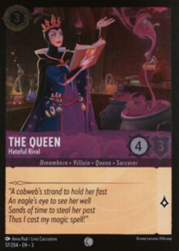 The Queen - Hateful Rival's Disney Lorcana cards are available in at least 1 sets. The Queen - Hateful Rival's biggest 7-day price movers are 2024 Into the Inklands #57/204 Cold Foil, and 2024 Into the Inklands #57/204 Base.