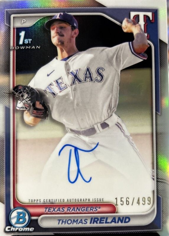 Thomas Ireland's Baseball cards are available in at least 1 sets. Thomas Ireland's biggest 7-day price movers are 2024 Bowman Chrome #CPA-TI Prospect Auto - Refractor /499 (1st), 2024 Bowman Chrome #CPA-TI Prospect Auto - Orange Shimmer Refractor /25 (1st), and 2024 Bowman Chrome #CPA-TI Prospect Auto - Red Refractor /5 (1st).