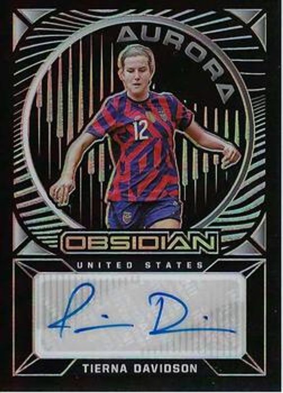 Tierna Davidson's Soccer cards are available in at least 6 sets. Tierna Davidson's biggest 7-day price movers are 2021 Obsidian #AU-TDN Aurora Autographs /149, 2021 Obsidian #AU-TDN Aurora Autographs - Electric Etch Yellow /10, and 2021 Obsidian #AU-TDN Aurora Autographs - Electric Etch Red Pulsar /44.