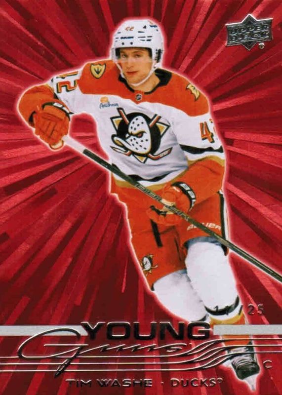 Tim Washe's Hockey cards are available in at least 4 sets. Tim Washe's biggest 7-day price movers are 2025 Upper Deck #206 Young Guns - Outburst Red /25, 2025 Upper Deck #206 Young Guns - Clear Cut, and 2025 Upper Deck #206 Young Guns - Deluxe /250.