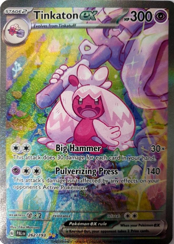 Tinkaton ex's Pokemon cards are available in at least 3 sets. Tinkaton ex's biggest 7-day price movers are 2023 Japanese Scarlet & Violet: Clay Burst #093/071 Special Art Rare, 2023 Scarlet & Violet: Paldea Evolved #240/193 Ultra Rare (Full Art), and 2023 Scarlet & Violet: Paldea Evolved #262/193 Special Illustration Rare.